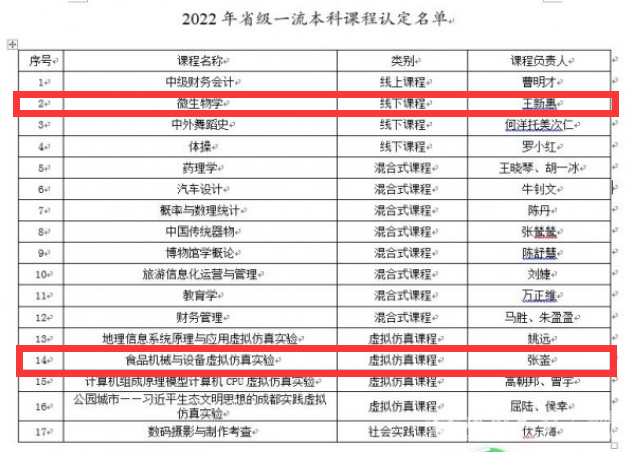 近日,《四川省教育厅关于公布2022年省级一流本科课程认定结果的通知》发布。我校17门课程获得认定,其中,黄色直播 王新惠教授负责的《微生物学》、张崟教授负责的《食品机械与设备虚拟仿真实验》双双获评省级一流课程。