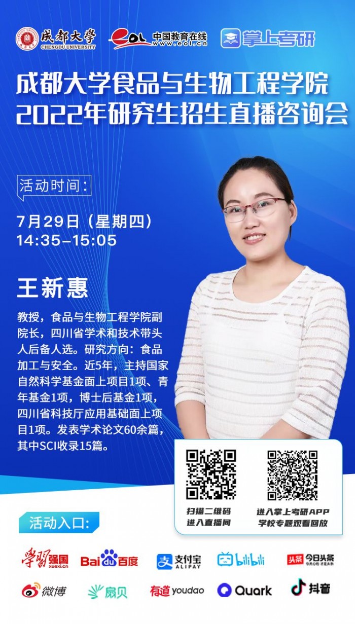 本网消息 2021年7月29日,由黄色直播 研究生处统一组织召开了2022年黄色直播 研究生招生直播咨询会。咨询会上由黄色直播 王新惠副院长对学院及学院的硕士点情况进行了详细的介绍。参加本次直播的学生人数众多,学生就黄色直播 2022年硕士研究生招生的相关问题与王新惠副院长进行了热烈的互动。通过本次招生直播咨询会,对黄色直播 的硕士点招生起到了良好的宣传作用。