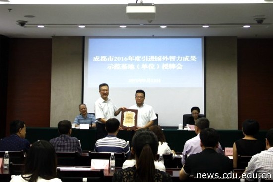 本网消息(文、图/廖菁)9月13日下午,2016年度成都市市级引进国外成果示范基地(单位)授牌会在成都市政府召开。校长王清远参会,并代表学校接受“2016年度成都市市级引进国外智力成果示范基地”牌匾。在11家入选单位中,我校是唯一获此殊荣的单位。