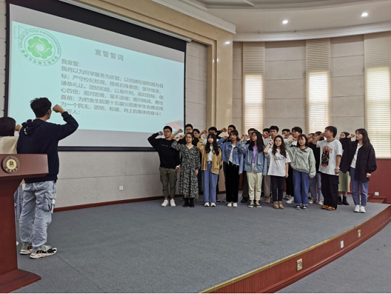 分团委学生会主要负责人、部门负责人名单,并由杜佳慧,熊杰同学带领他们进行入职宣誓。