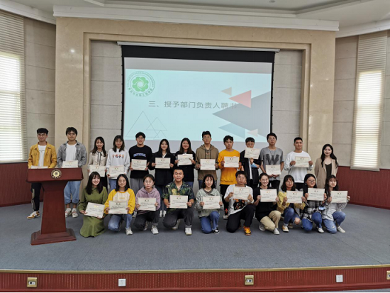 大会在嘹亮的团歌中拉开了序幕。游曌老师分别为分团委学生会及艺术团主要负责人和学生会部门负责人授予聘书,并感谢各位组织负责人这一年来对于学院学生工作的付出。