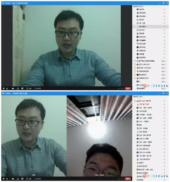 在2016级制药工程班会自由交流阶段,来自湖北籍3位同学也通过视频交流分享了自己近期在家乡生活、学习情况,他们说请班主任和各位同学放心,相信有在全国人民的共同努力和帮助,我们一定可以打赢防控疫情的阻击战。