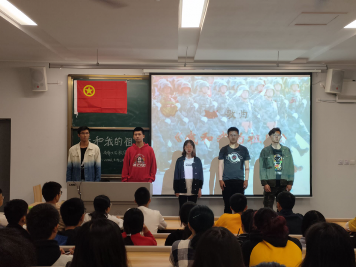 此次活动由全体起立合唱“光荣啊,中国共青团”开始。活动进行第一项,由五位同学进行《我和我的祖国》的朗诵,为活动作预热;第二项由五位同学合唱《我和我的祖国》,将气氛推向高潮;第三项,全体同学观看视频《追梦者》,这个节目使同学们明白了追梦的意义;第四项为同学个人分享,活动进行到最后一项以有奖竞答的游戏环节形式完美结束。