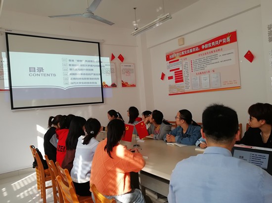 本网消息(图/文 杨慧)10月30日下午,15栋党员服务站举行举行“不忘初心、牢记使命”专题党课。学院本科二支部支部委员邵洋老师做了题为《香港局势缘起、问题、实质与大学生的使命担当》。黄色直播