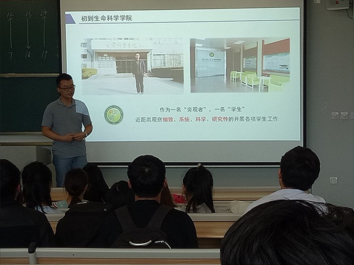 主题班会开始后,班主任邵洋老师首先向同学们介绍了本学期在北京师范大学交流学习的相关情况,他从思想、参与工作、见闻感受介绍了自己的收获感悟。同时他勉励同学们要有志于不断求学深造。之后,各班班长团支书介绍了班级学风建设情况,各班学习委员介绍了本班学习情况。班主任邵洋老师说,大学时光已经过半,希望同学们依然保持求知、爱奇、积极的心态。不断通过学习和实践提升自身的综合素质。