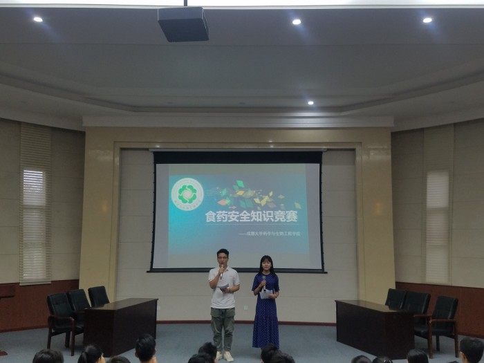 学生对食药安全相关知识的了解,增强自身综合能力。本次竞赛以班级为单位,每个班级派出三人组成代表队,五人为后援团。药生院学生会主席团受邀来到此次比赛现场。