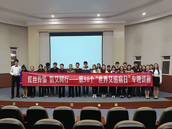 学生社团联合会和医学院(护理学院)学生社团联合会于11月28日晚上,开展了“红丝传情,防艾共行”——第30个"世界艾滋病日"专题讲座。院学工办主任唐远谋老师、分团委书记邵洋老师以及各学院二级社联主席出席了此次讲座。医学院伍艺老师担任此次讲座主讲人。