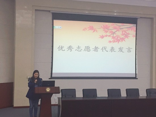 优秀志愿者代表朱星润同学作为志工部的干事提出了自己对“孝老爱亲”的看法,一个学期的志愿者活动让她感触颇多。虽然在志愿服务过程中牺牲了许多休息的时间,但在志愿服务过程中尤其是在与孤寡老师、留守儿童的互动当中也认识到了作为青年大学生的责任。“孝老爱亲”需要我们认认真真去践行。
