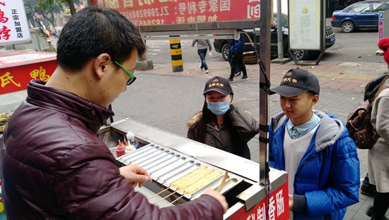在结束参观成都博物馆之后,活动小组来到建设路。开展“寻找成都美食印象”线索活动。每个小组有固定的资金,可以选择抽取1—4张美食图片,根据图片显示的美食,迅速找到美食并带回。最先找回线索特色美食的队伍为胜,寻找美食开始后同学们迅速出发。在完成购买一种美食之后还需要回答完问题之后才能够寻找下一种美食。在经过近一个半小时“寻找美食”活动圆满结束。