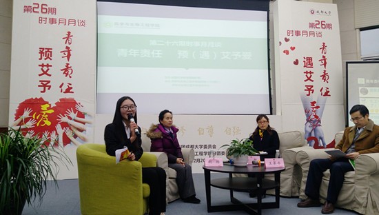 12月20晚,由药学与生物工程学院承办的第26期时事月月谈在九教演播厅举行。本期“时事月月谈”的主题为“青年责任 预(遇)艾予爱”,旨在促进青年大学生对艾滋病的预防和了解,同时给予艾滋病人更多关怀。本期邀请的嘉宾分别为师范学院胡珍教授,龙泉驿区疾控中心李敏科长,以及校医院王革平院长。