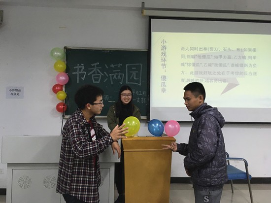 团活初始,由主持人简述本次团活“书香满园”的主题,全场高唱团歌。之后,主持人以PPT的形式向大家展示了读书的重要性与必要性,通过互动邀请大家推荐喜爱的书目,令现场气氛变得活跃,后主持人列出各名校推荐的读书清单,并作出相应介绍,号召大家“多读书,读好书”。最后是有奖游戏环节,在同学们的欢笑中,此次团活落下帷幕。
