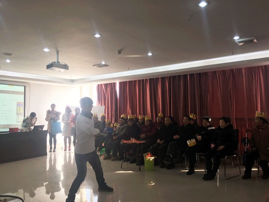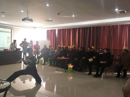 三名同学参加,表演气势磅礴,次时全场气氛高涨,老爷爷老奶奶们脸上都洋溢着幸福的微笑。活动过程中进行了两次抽奖,十位幸运的老爷爷老奶奶获得了同学们准备的贴心奖品。最后,大家一起分蛋糕,由年龄最大的老奶奶为大家切开第一块。老爷爷老奶奶们对同学们带去的快乐感到十分高兴并且很是感动。