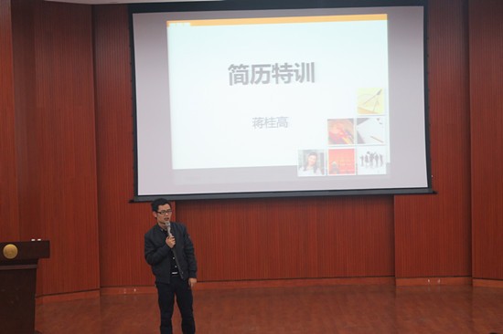 首先,主持人介绍了到场嘉宾,同学们热烈的掌声展示了大家对各位嘉宾的欢迎。紧接着,全体肃立齐唱团歌,激情昂扬的团歌正式为此次活动拉开了序幕。接下来,主持人介绍蒋桂高老师上台开始演讲。风趣幽默的蒋老师在讲演过程中十分的随和,多次关心全程站着的主持人,不时与同学们开些玩笑,使得整个演讲过程趣味盎然。蒋老师通过举例子的方法给大家讲到简历基本要素及简历制作中的误区,为同学们将来走上社会打下坚实的基础。