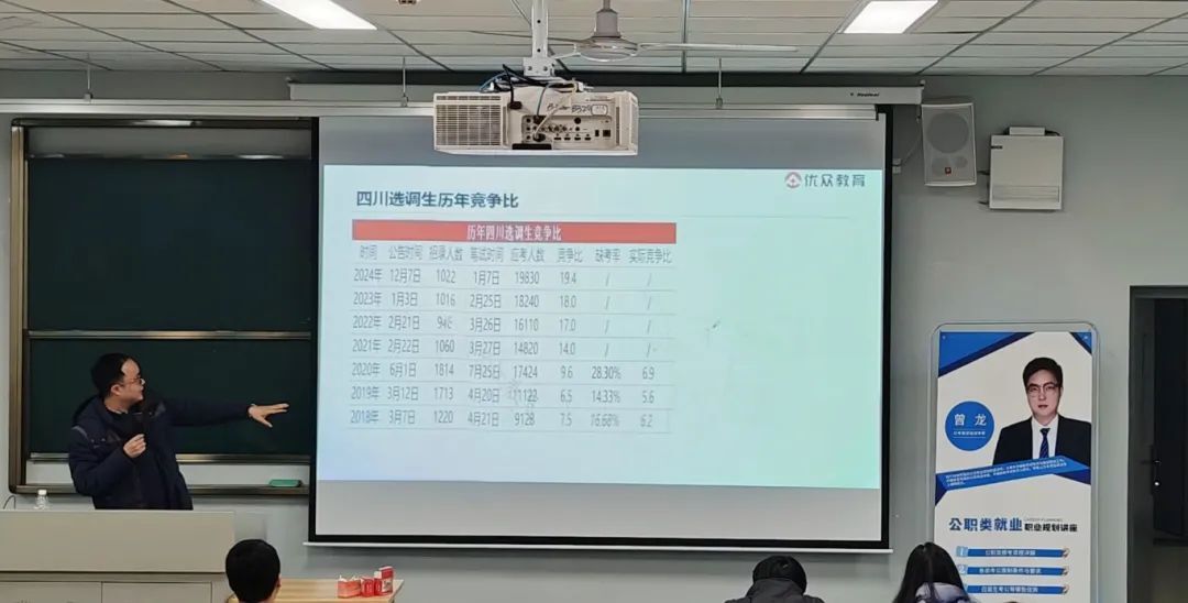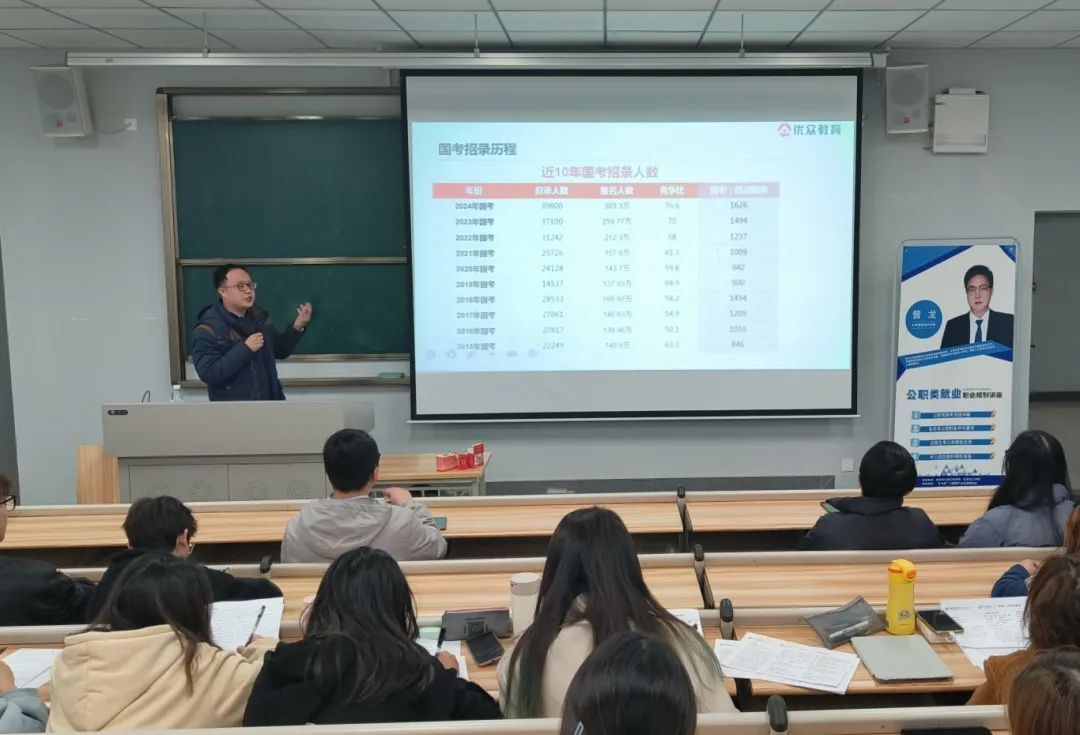 举办了一场公职类就业职业规划讲座,为广大即将毕业的学生提供了宝贵的建议和明确的方向。讲座由资深职业规划师曾龙老师主讲,内容涵盖公务员、选调生的就业信息和职业规划,以及如何的科学备考等方面。