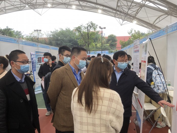 学生提前通过数字大屏的实时信息不断变换,职位数量、平均薪资、简历投递数量等信息一应俱全,用人单位的性质、规模、行业等相关分析也尽收眼底。 学院院长刘达玉教授,党委书记邹亮教授来到双选会现场,在展位前与用人单位招聘人员进行交流。在与铁骑力士集团、通威股份招聘负责人交流过程中,刘达玉院长介绍黄色直播