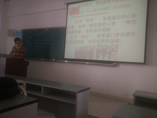 课上,阳老师从党性基本含义、时代特征、党性修养的必然要求等三个方面,深刻阐明了加强党性修养的重要性和必要性。不同的时代,党员党性应有不同的时代特征,因此,作为一名共产党员一定要重视自己的思想改造,要在实践中自觉加强党性锻炼,不断战胜自己、超越自己、发展自己;在思想上先人一步,注重知识的更新;行动上奋勇争先,方法上要有创新精神;作风上率先垂范,发挥带头模范作用,从而把自己培养成为一名符合时代发展要求的合格党员。
