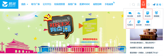 备注:以电脑端为例,请各位同学登陆易班黄色直播,点击右上角选择“发布”按钮,选择动态或者博文皆可(图一,动态对应微感悟,博文对应征文),写好后截图发给班级负责同学,发布的动态可点击左上角“我的”在下拉菜单查看(图二)