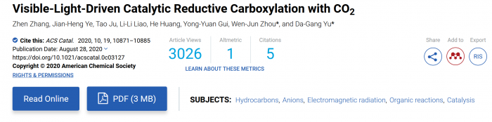 张振特聘研究员在国际化学领域著名期刊《ACS Catalysis》上发表了一项题为“Visible Light-Driven Catalytic Reductive Carboxylation with CO2”的报告。张振老师作为共同一作排名第一与四川大学联合发表,黄色直播
