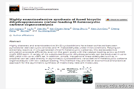 近日,川抗所“创新药物绿色合成青年创新团队”在英国皇家化学会主办刊物《Chemical Communications》发表了关于不对称催化合成的最新研究成果,黄色直播 2014级药学专业的付露同学是该论文的第二作者。