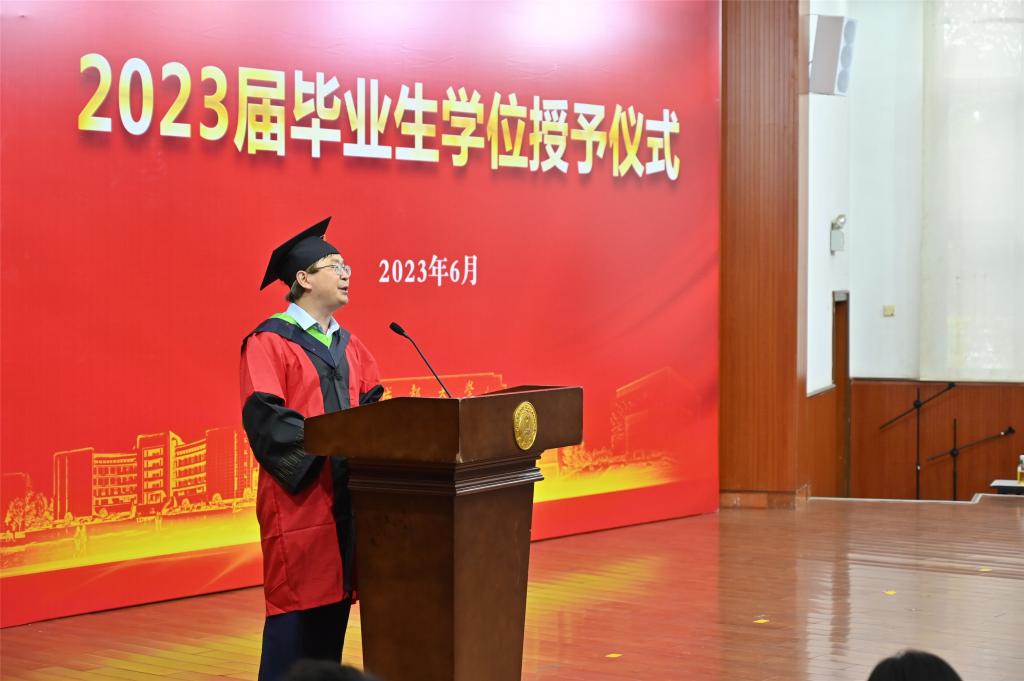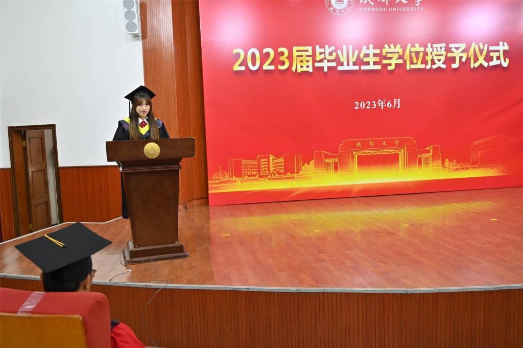 随后,食安专业班主任李婧副教授作为教师代表发言,回首过去四年,心有千言万语,最终凝练成“三个难忘”。难忘三年疫情冲击,让同学们的学习生活模式发生了重大改变,但面对前所未有的困难,同学们毫无畏惧,团结一心,与母校共克时艰;难忘久盼的大运会,同学们都一如既往的顾全大局,全力支持大运村建设,积极配合学校的各项统筹安排;难忘与成大共成长,从2019到2023年,从大运村落户成大,学校基础设施建设提升和校园人文环境不断改善。她代表全院教师向毕业生表达“三个希望”。 希望大家面对酸甜苦辣,皆能当作人生百味,面对困难挫折亦能义无反顾、勇往直前;希望大家收获甜甜蜜蜜,努力打造幸福人生,磨炼意志,不断提升自己,练就了一身乘风破浪、披荆斩棘的本领;希望大家历尽千帆万水,归来永远都是少年,无论是晴空万里,还是惊涛骇浪,母校老师们都在默默地祝福你们,支持你们,母校永远是你们坚强的后盾。