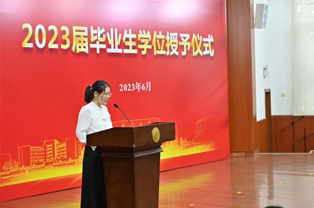 毕业生代表2019级食品质量与安全2班学生林雪熠同学上台发言,她首先代表全体毕业生感谢学院和老师这四年来的悉心教导和精心栽培。她说,时光犹如白驹过隙,四年过往历历在目,2023年盛夏,我们收获了累累硕果,以优异的成绩向四年的大学生活交出了一份满意的答卷。祝愿我们的母校、学院蓬勃发展,再谱华章,祝愿各位领导老师身体健康、工作顺利。
