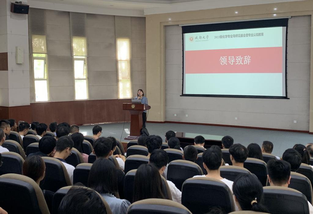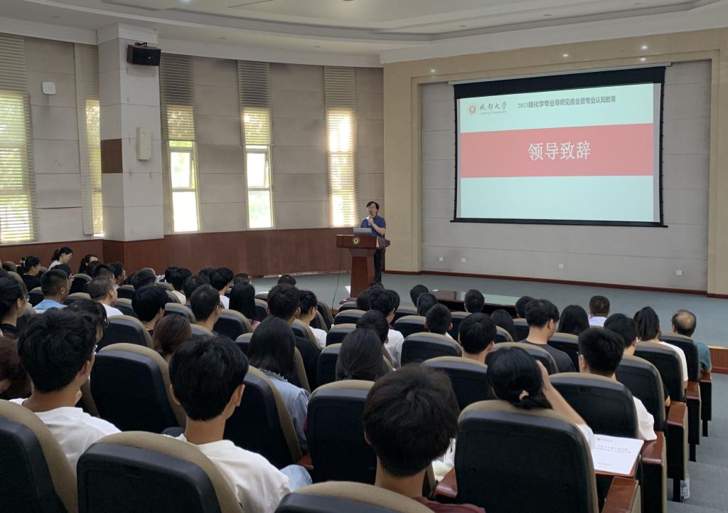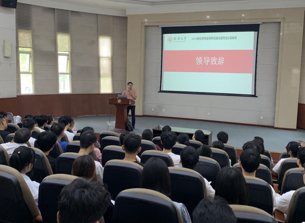 会上,刘达玉院长发表了热情、真挚的讲话,他代表学院全体师生对2023级化学专业新生的到来表示热烈的欢迎和衷心的祝贺。刘院长首先介绍了学院化学专业的建设历程、师资力量及学科优势,鼓励同学们明确目标、树立信心,以积极向上的态度去迎接即将到来的大学生活,不断进取,追求卓越。