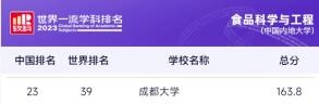 共有3个学科上榜。上榜学科中,1个学科(食品科学与工程)位于世界前50名,2个学科(化学、化学工程)位于世界第201-300名。