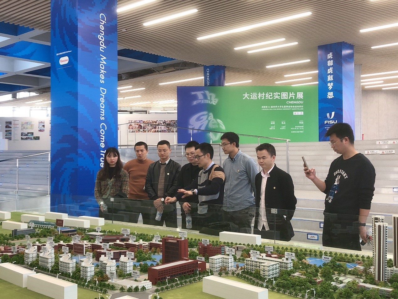 返校校友在学校正校门合影后。来到“校友之家”了解学校历史沿革,在看到学校“541”发展规划,更好地服务成都、服务成渝地区双城经济圈的高质量建设之后,感叹近年来学校高质量发展的成效,为学校明天发展的前景更加期待。作为校友将继续关注母校、支持母校,为母校的发展做出新的贡献。随后,返校校友观看了新图书馆和成都大运会行政保障中心(大运村沙盘),了解到学校作为成都第31届世界大学生夏季运动会运动员村所在地,不仅承担大运会赛事举办期间青年运动员休息、训练的功能,而且也发挥休闲、交流、商业功能让赛事期间选手的生活更加丰富多彩。校友们纷纷点赞学校硬件设施的改善和国际化水平的提升,相信学校将来的发展会更好。