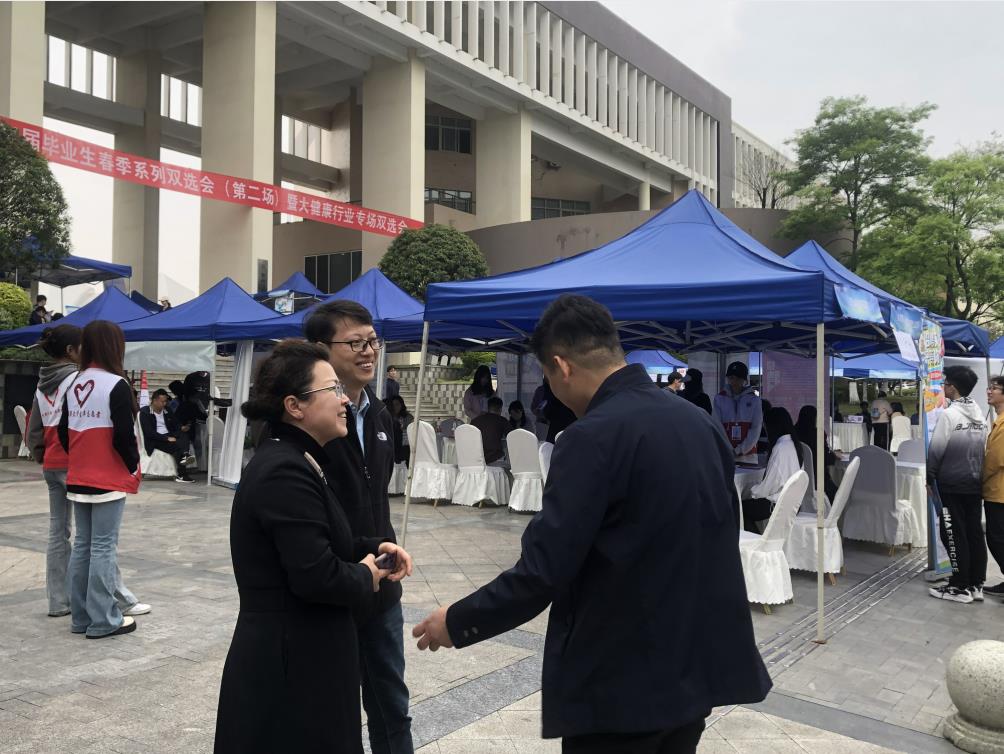 “职遇橙园,社区同行”2024届毕业生春季系列双选会(第二场)暨大健康行业专场双选会于第九教学楼园区顺利举行。此次双选会吸引了绝味食品股份有限公司、四川省曾食记食品有限责任公司、四川品品食品有限公司、成都诺迪康生物制药有限公司等80余家优质单位带来约1500个岗位需求。学院党委书记孙雁霞、副书记李云成 蒋桂高来到双选会现场,指导做好双选会各项保障与服务工作,并与用人单位深入沟通交流。