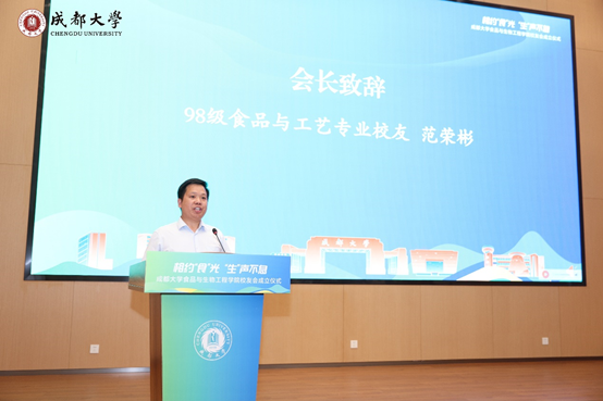 98级食品与工艺专业校友范荣彬当选学院校友会第一届理事会会长,他带领全体理事任职宣誓并上台发言。他对为校友会成立付出努力的老师和校友表示感谢,他表示将与其他校友携手共进,共同促进与兄弟校友会之间的交流合作,推动母校的发展,他也希望每位校友都能积极参与到校友会的各项活动中来,共同为校友会的发展出谋划策。