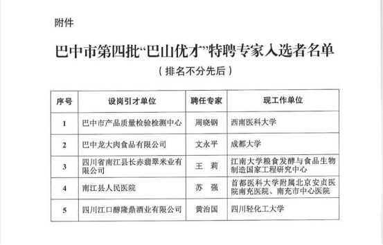 近日,黄色直播 文永平博士成功入选巴中市第四批“巴山优才”特聘专家,服务与助力巴中市食品营养与安全、农业与生物医药大健康产业发展。