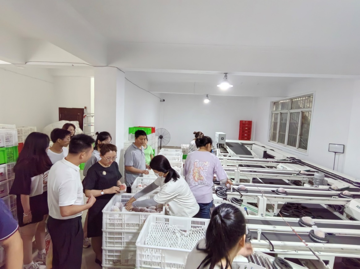 与企业共建的水蜜桃示范基地内,王新惠现场指导了本科生、研究生开展水蜜桃品质的快速检测,并在四川盘信农业有限责任公司调研水蜜桃全自动无损分拣线,建议企业根据早、中、晚熟品种进行科学建模,按照单果重、可溶性固形物含量等指标进行分级销售,优质优价,提高销售收入。