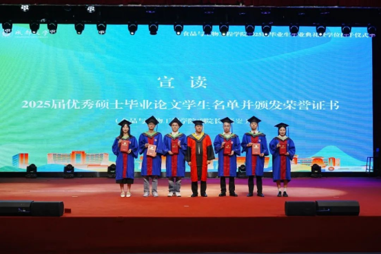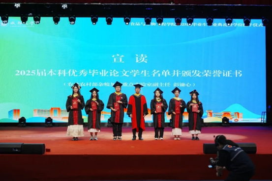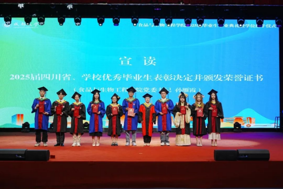 典礼上,学院党委书记孙雁霞教授宣读了2025届四川省及校级优秀毕业生表彰决定;副院长张崟教授公布了优秀硕士毕业论文获奖名单;农业农村部杂粮加工重点实验室副主任彭镰心教授揭晓优秀本科毕业论文获得者。与会领导依次为获奖学生颁发证书,勉励他们再接再厉,以卓越成就回馈社会。