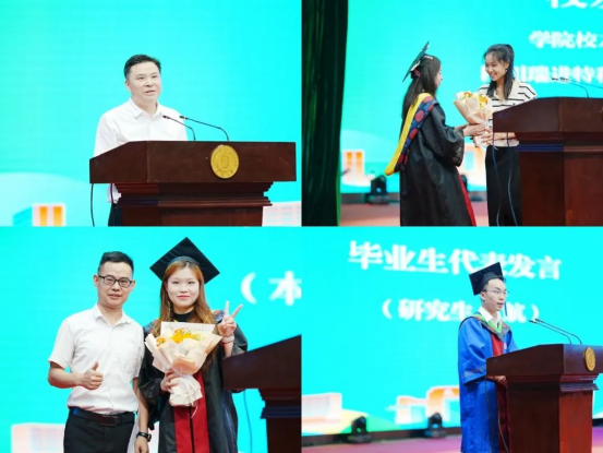 四川省青年科技创新团队带头人康泰然教授作为教师代表发言,他鼓励毕业生“以科学精神照亮前路,以创新担当书写人生”。家长代表李季高先生由衷感谢学院的培养,嘱托学子“永葆乐观,勇克难关”。研究生袁航与本科生李玲钰作为毕业生代表,深情回忆求学时光,并将“以奋斗为母校增辉”。