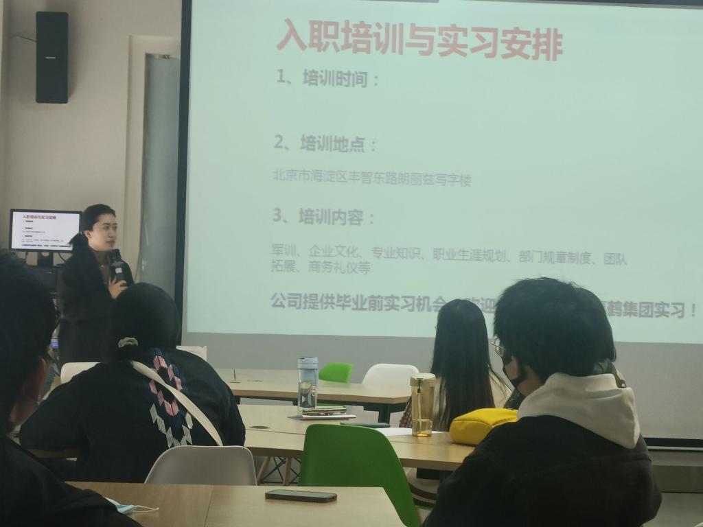 之后李经理介绍网申、面试、复试的流程,同时介绍了公司的人才培养和薪资待遇。同时公司各个部门的负责经历也通过视频介绍了相关情况,对大学生入职之后的工作发展进行了交流介绍。