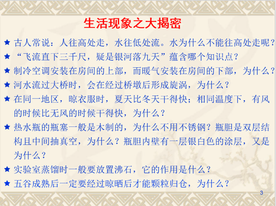 教学方法:化工原理作为一门偏工的课程,许多工程理论和观点都是学生所不熟悉的,没有感官认识做基础,学习难度可想而知。为了加深学生对化工原理理论的理解,在第一节课,就提出了若干个司空见惯的生活现象,让大家去思考和总结,通过对这些现象进行抽丝剥茧式地分析,最终把理论与生活实践有机结合,达到知行合一,融会贯通的目的。